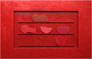 Die Schaukästen sind als Modelle für Bilder zu verstehen. Das Rahmenelement ist aus Sperrholz, Tiefe: 4,5 cm. Das Motivfeld liegt unter Glas. Darin stehen die Formen auf Leisten. Alle Teile sind mit mehreren Schichten Wachs belegt.